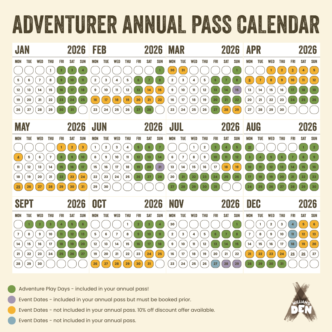 Give your family a whole year of unforgettable adventures at William’s Den with our incredible Adventurer Pass. Packed with value, perks, and plenty of playtime, it’s the best way to enjoy everything the Den has to offer - again and again!